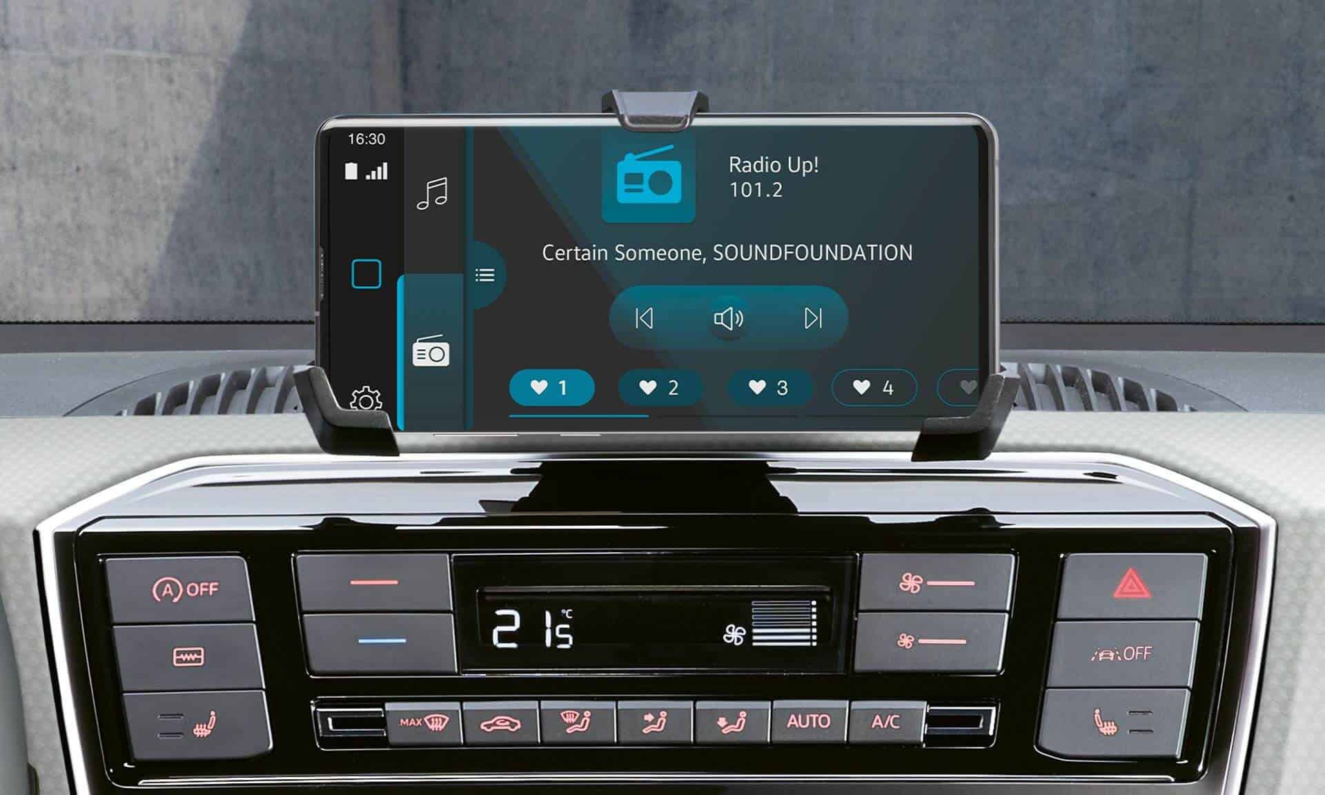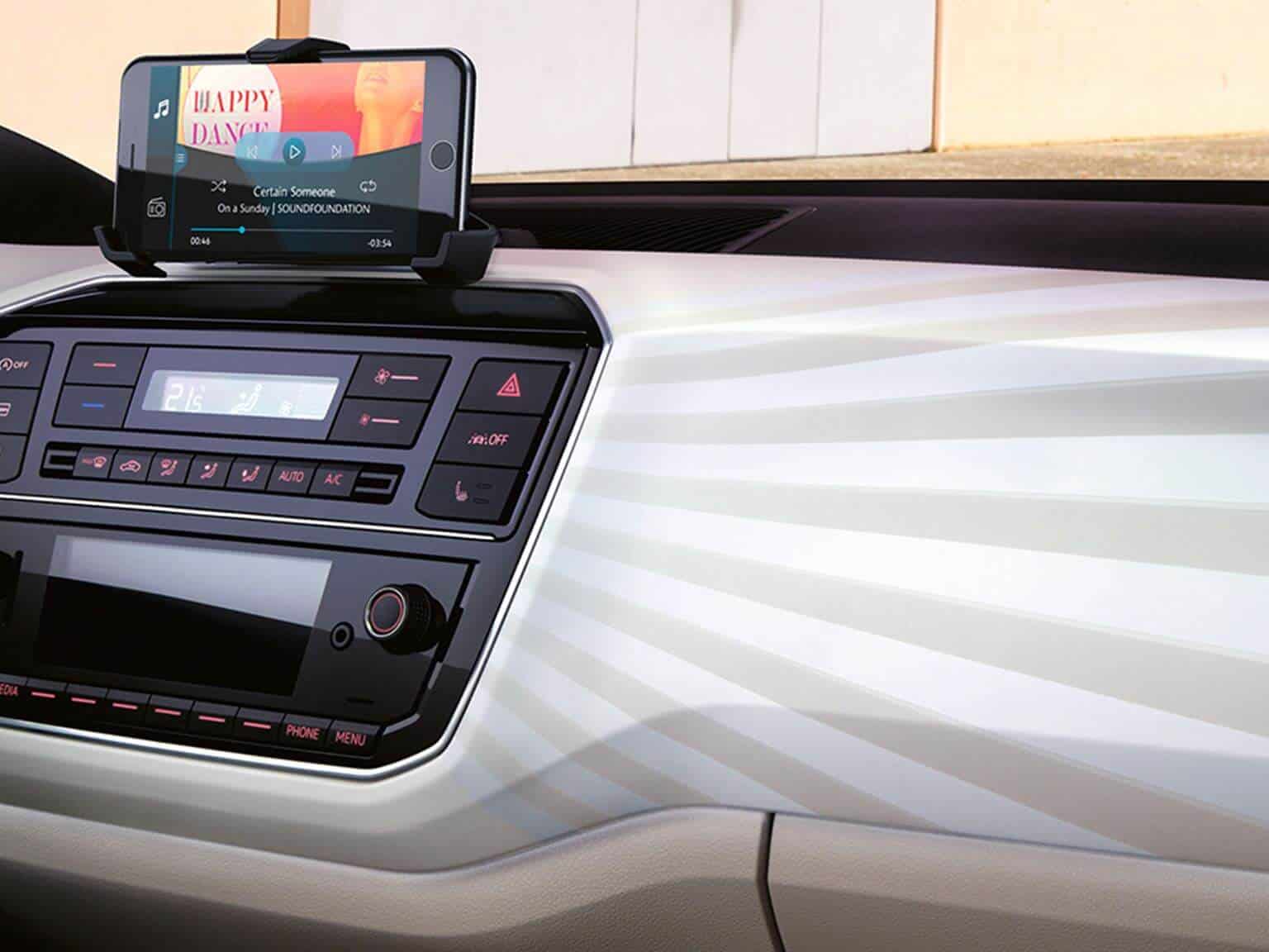 Vieni a scoprire la radio Composition Phone, di serie sulla Nuova up!, con presa AUX-IN, slot per scheda SD, interfaccia per telefono e USB per collegare facilmente il tuo smartphone e ascoltare la tua musica preferita. A bordo sono installati la ricezione radio digitale DAB+ e due altoparlanti di serie, mentre su richiesta sono disponibili sei altoparlanti con il Sound Pack. Inoltre, collega il tuo smartphone alla docking station maps+more* e utilizza l’App gratuita maps+more per avere sempre tutto sotto controllo durante la guida.